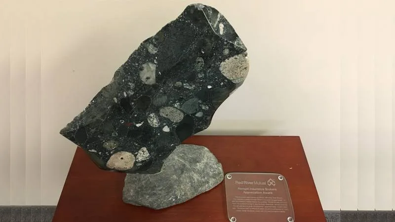 We are thrilled to be recognized with a Milestone Award for our business success. Brian Esau, CEO of Red River Mutual, recently presented the award to President Lynn Rempel & congratulated the entire team for the quality work and excellent customer service we provide our clients. This sculpture was created by Altona, MB artist Todd Braun. The material is called Archean Metamorphosed Conglomerate – a relatively rare and unique rock to the prairies. The stone was collected from the surface of what is now Northern Manitoba, carried there by the last glaciers to cover the province – approximately 12,000 years ago. The stone itself is millions of years old and is comprised of many rocks inside the stone – each with its own formation history.