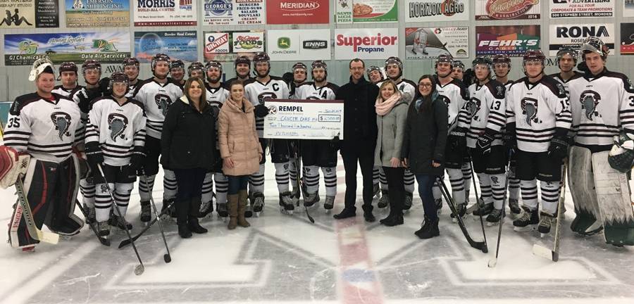 Rempel Insurance was proud to kick off the Pembina Valley Twisters’ 10th Annual Cancer Care Fundraiser with a $2,500 donation. Several local hockey teams teamed up to raise awareness and support the fight against cancer. The Mud Bugs and Rebels hosted games in St. Jean on January 31 and February 1 with a silent auction and 50/50 draw.