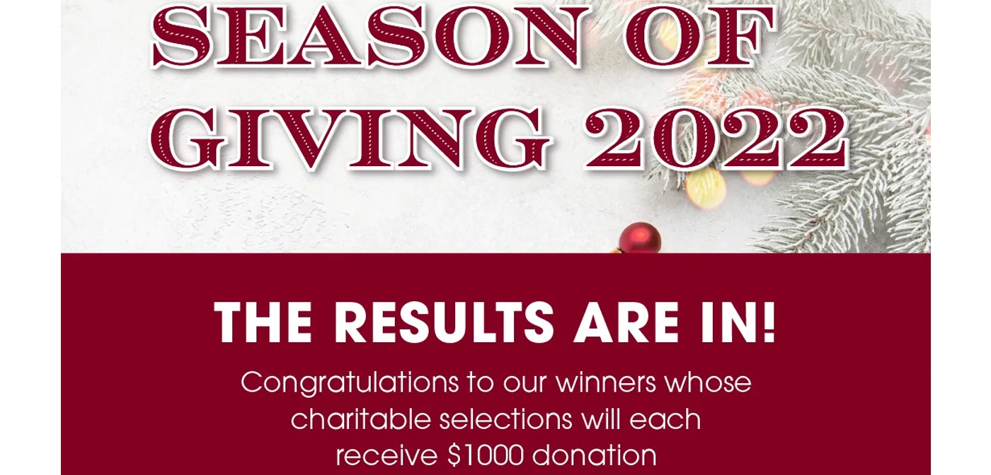 Our 2022 Season of Giving results are in! Congratulations to our winners, each selected charity will receive a donation of $1000!